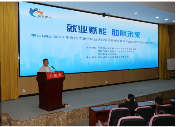 为增强高校毕业生就业创业信心,激发就业热情,5月27日,观山湖区人社局联合贵州职业技术学院举办了高校毕业生学长就业创业分享会活动,邀请到学校2021届优秀毕业生陈易鹏重返母校,与学弟学妹分享就创业经验。